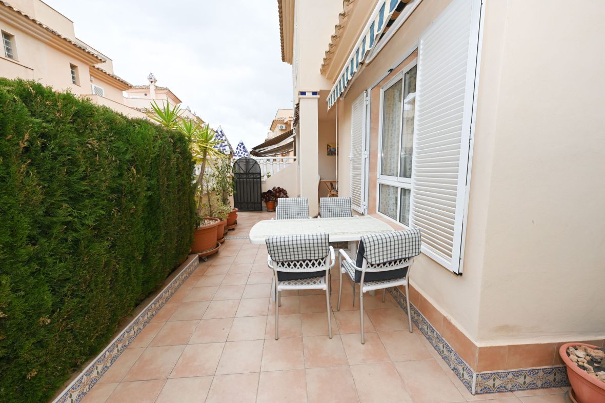 Planta Baja: Entramos directamente en la terraza privada en esquina desde una calle peatonal de la urbanización. Aqui hay zona para comer al aire libre además de la parte lateral de la terraza donde encontramos un útil trastero. Del porche frontal con toldo entramos al amplio salón-comedor, cocina independiente, amplia galería, un dormitorio y un baño con ducha.En el salón hay pre-instalación hecha para instalar una chimenea si se desea.