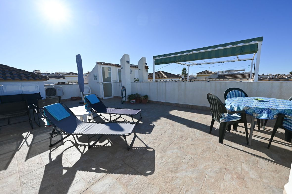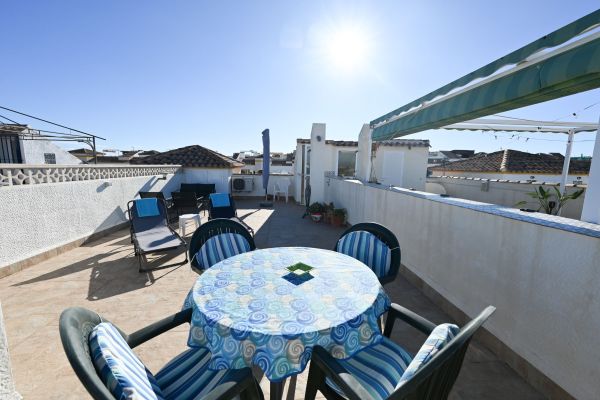 Del salon se accede a una bonita terraza, orientada al sureste, perfecta para disfrutar del sol de mañana. Subiendo por una escalera techada se tiene acceso al amplio solárium, zona privada, perfecta para disfrutar el buen clima de la zona, con vistas despejadas al mar y a la montaña. Se ha instalado aquí un trastero.