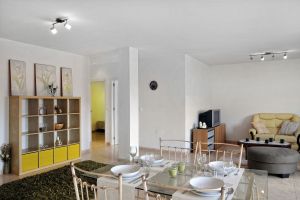 A spacious and bright living room, two double bedrooms with built-in wardrobes, two full bathrooms (one with a corner bathtub), a modern semi-independent kitchen with a utility room, and a useful storage room.