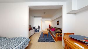 Bright living-dining room, bathroom with shower, fully equipped kitchen, and roofed utility room.