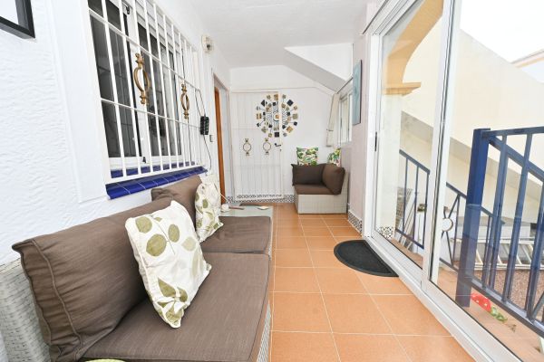 Accedemos a la vivienda por el porche acristalado con puertas correderas. Aquí en el porche encontramos un rincón muy acogedor, con sofás cómodos, el sitio perfecto para reunirse con amigos en cualquier época del año.